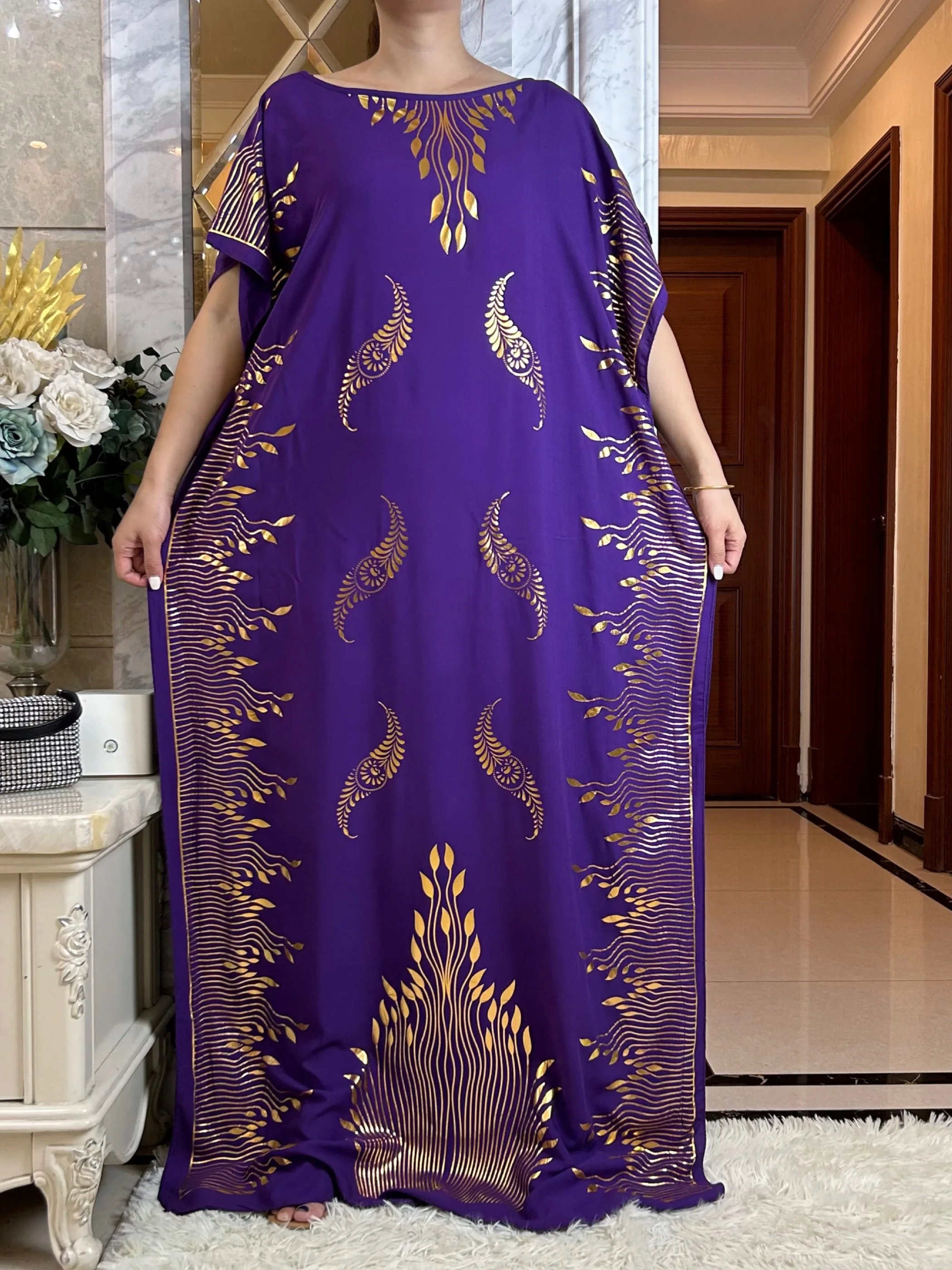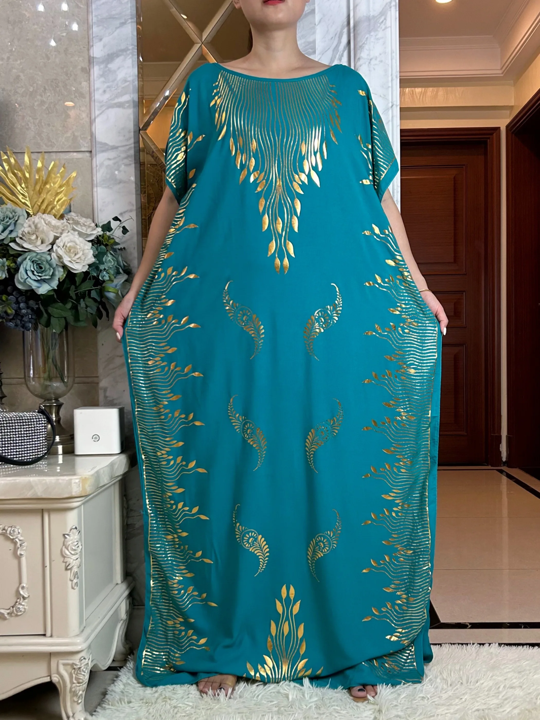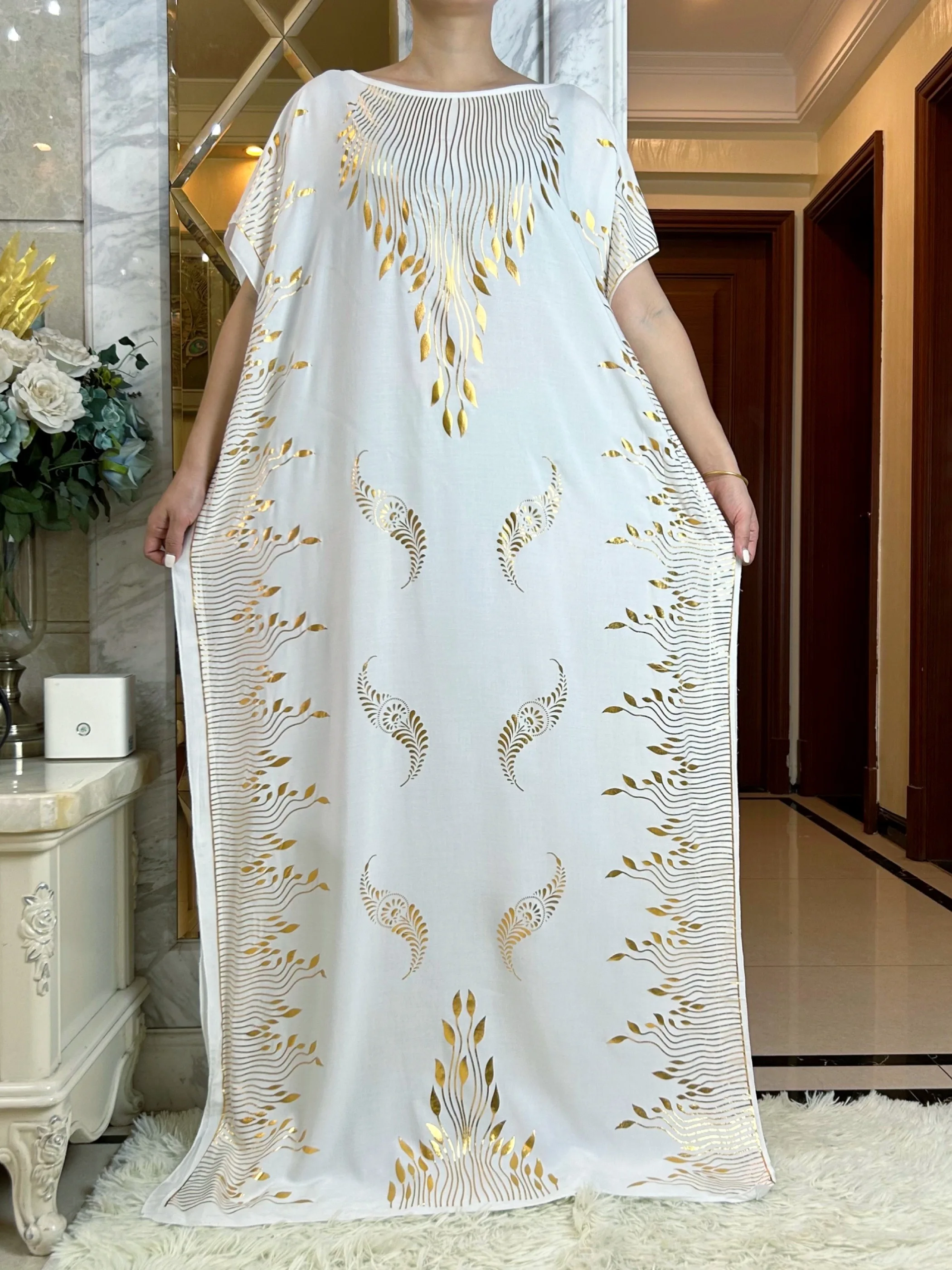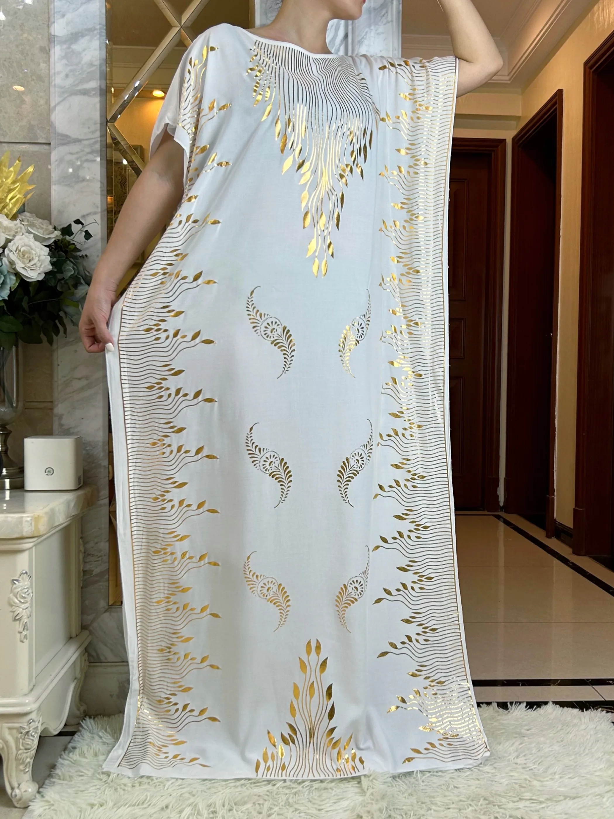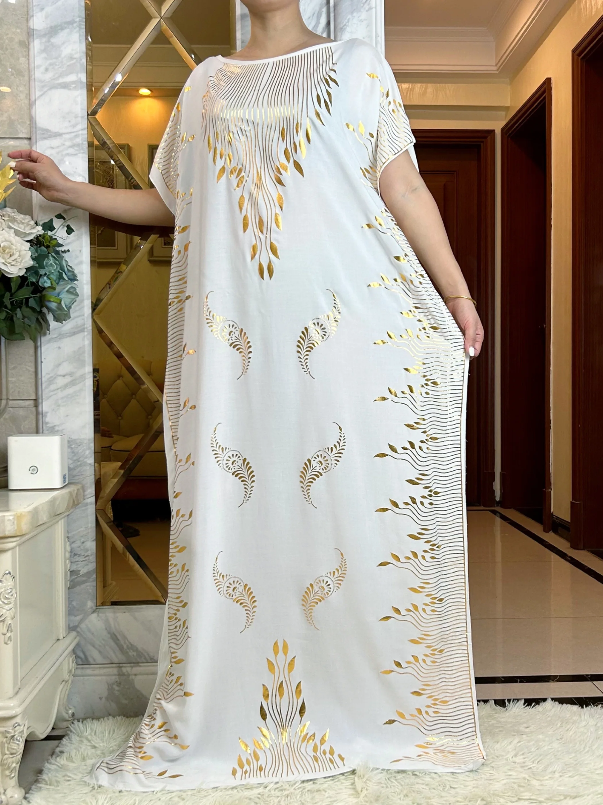 2023 Summer Short Sleeve Dress Cotton Gold Stamping Boubou Maxi Islam Women Femme Dress With Big Scarf African Loose Clothes
