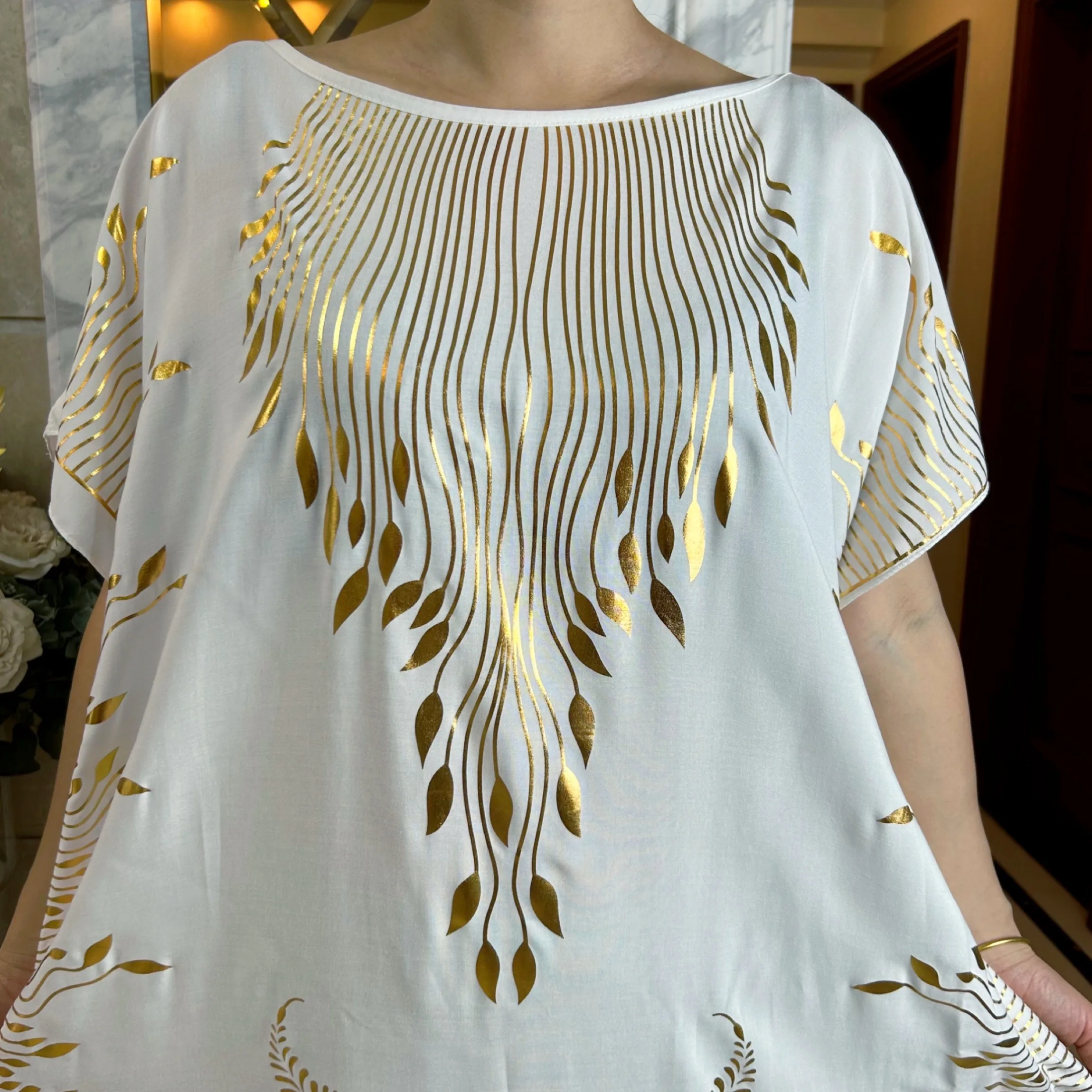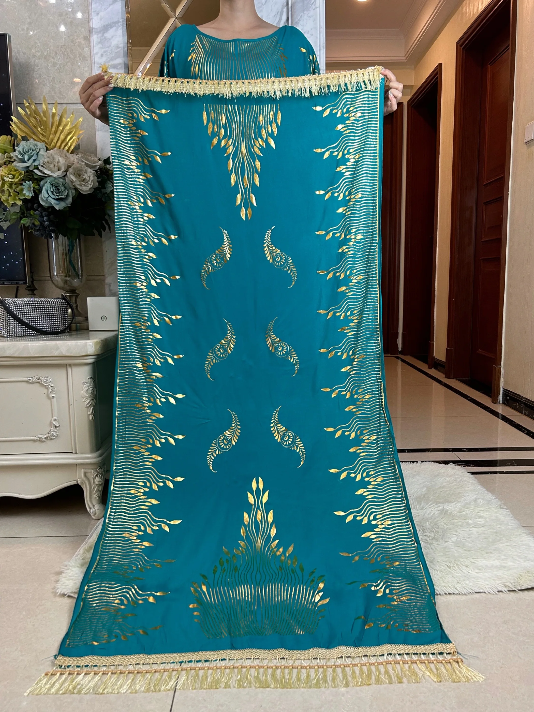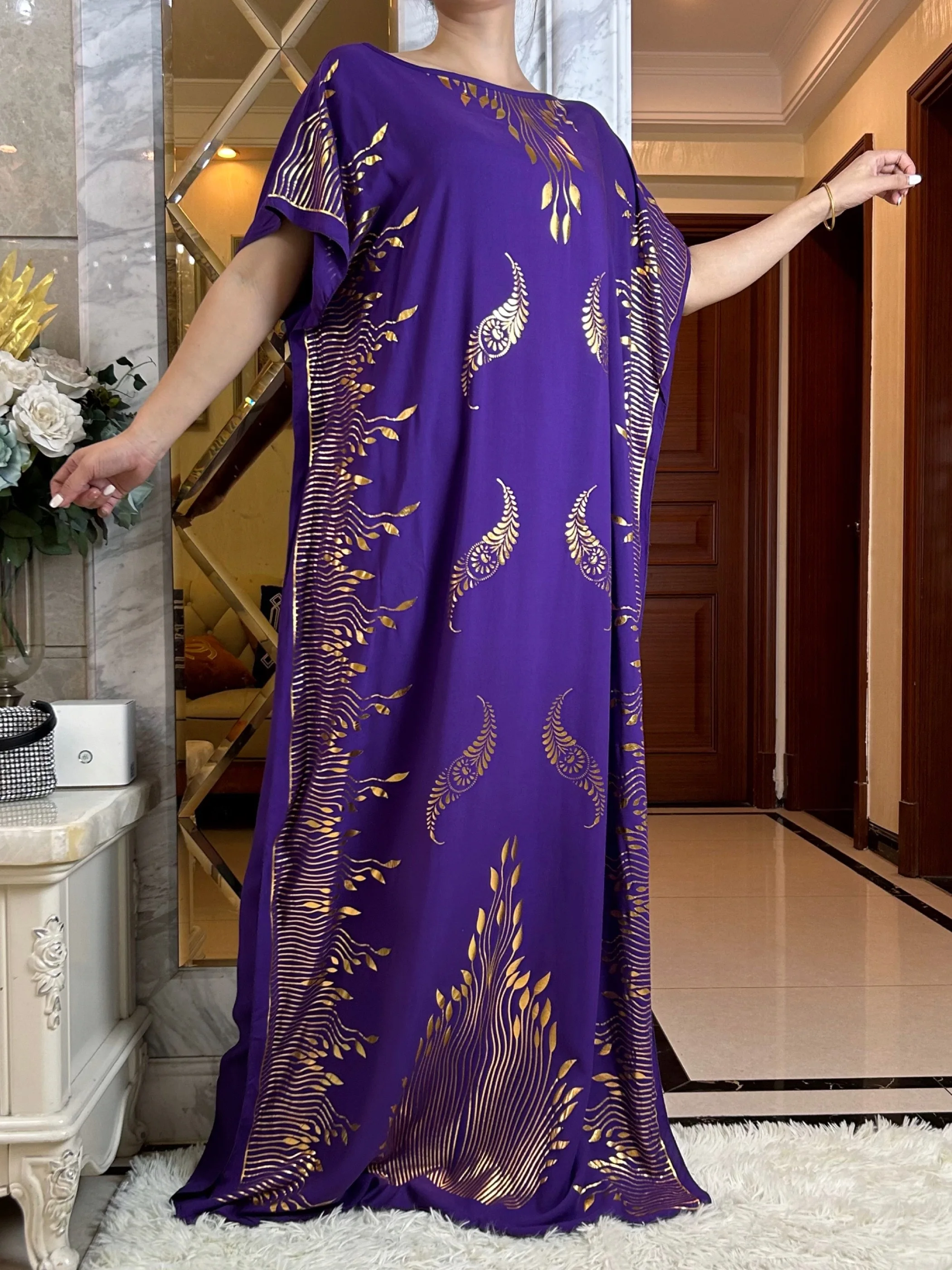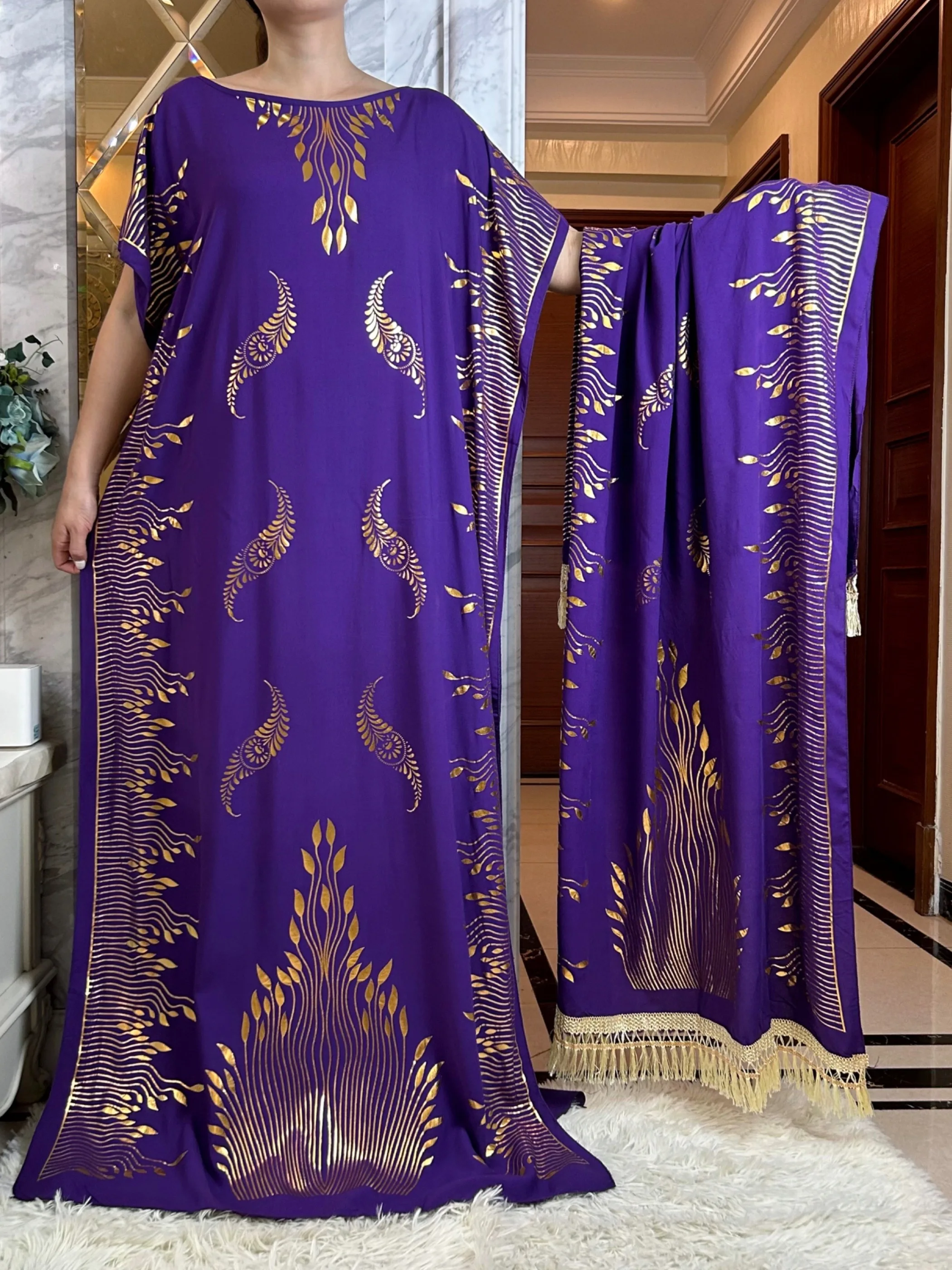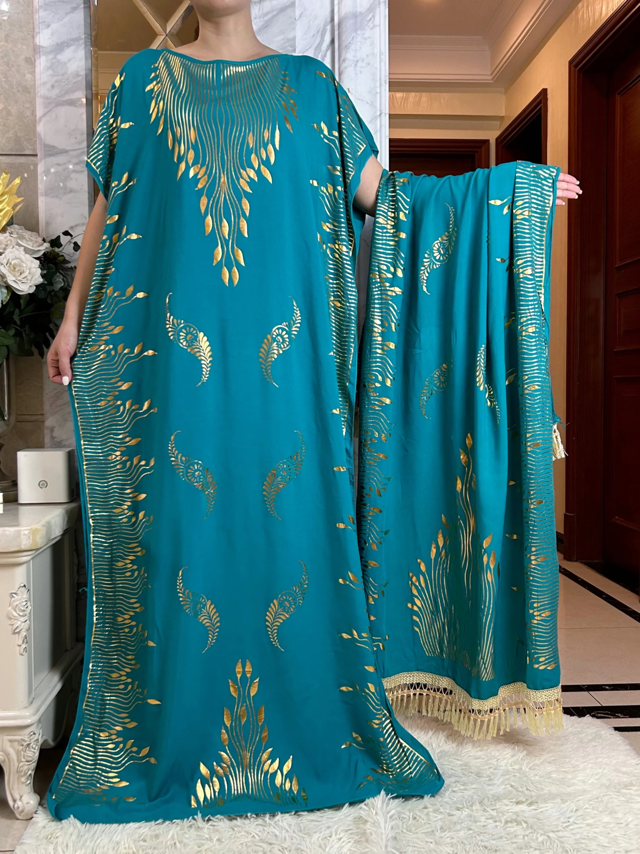 2023 Summer Short Sleeve Dress Cotton Gold Stamping Boubou Maxi Islam Women Femme Dress With Big Scarf African Loose Clothes