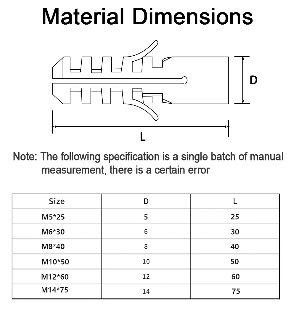 | Specification | M14x75, M12x60, M10x50, M8x40, M6x30, M5x25 |