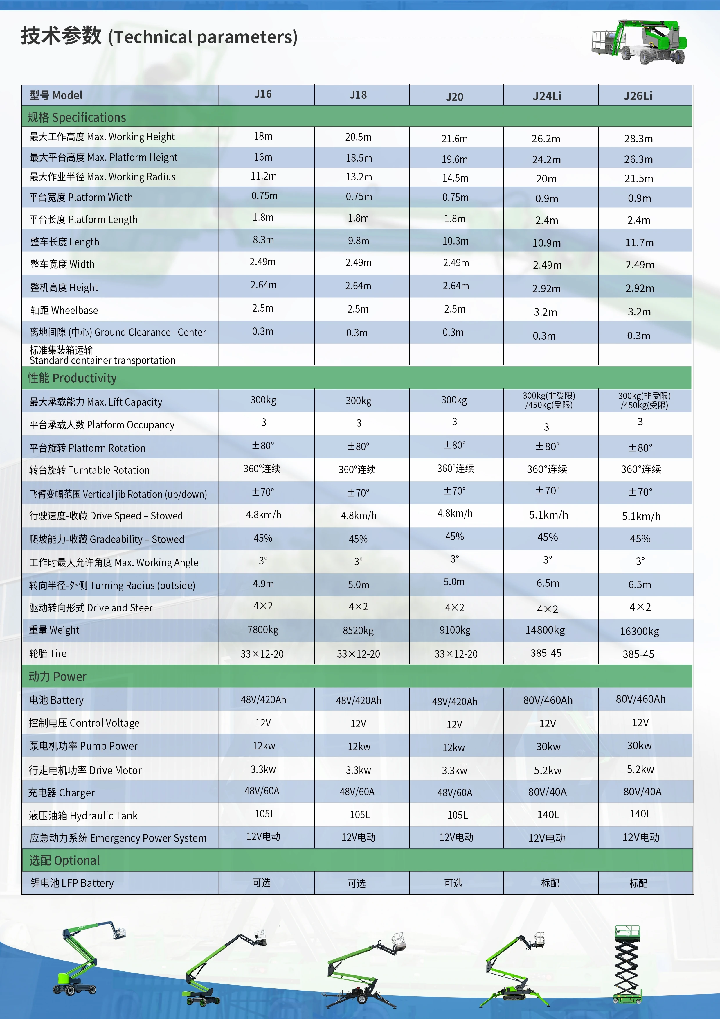J20 J26Li 20m platform height Electric Telescopic Boom Lift, battery manlift.