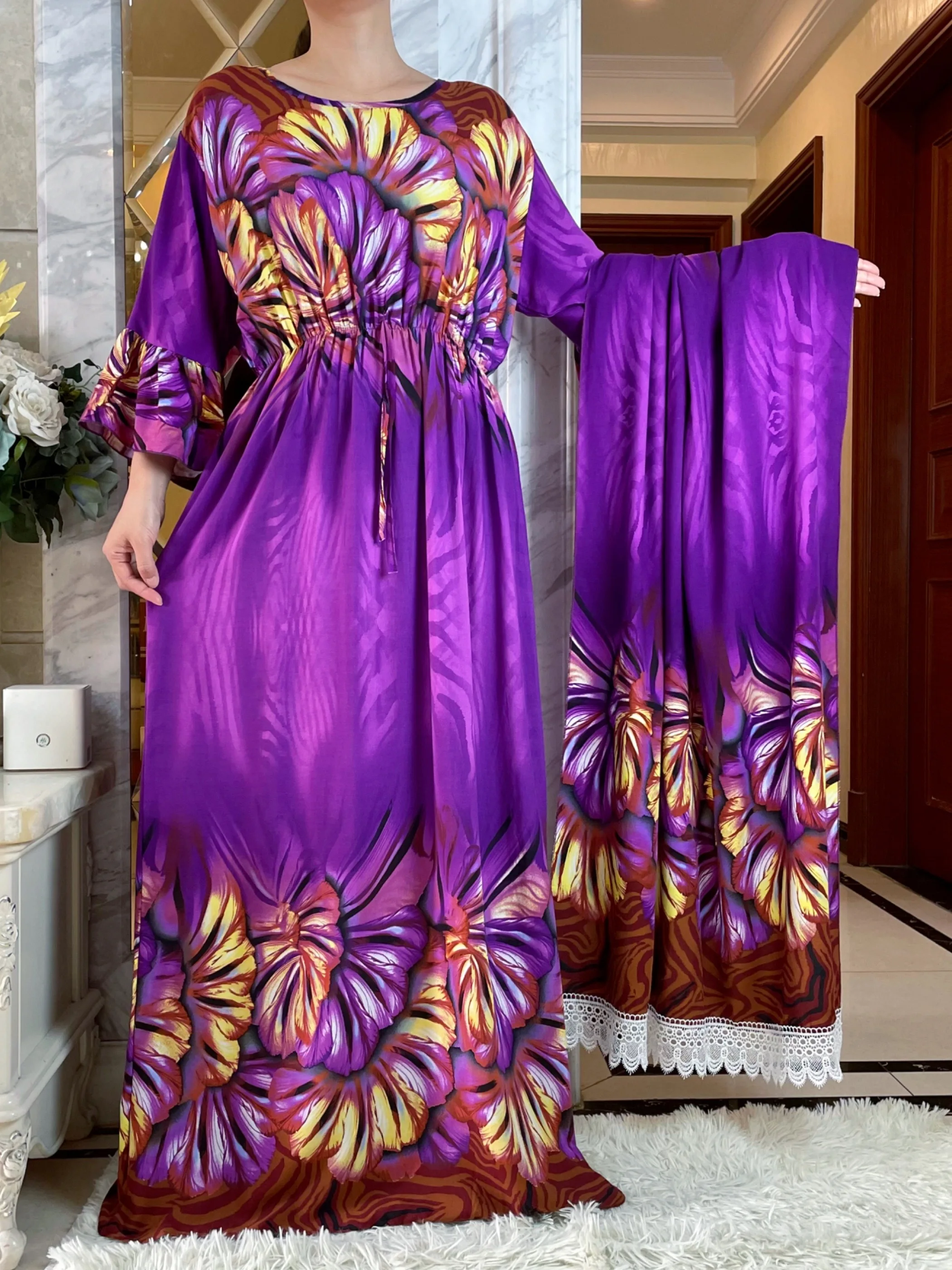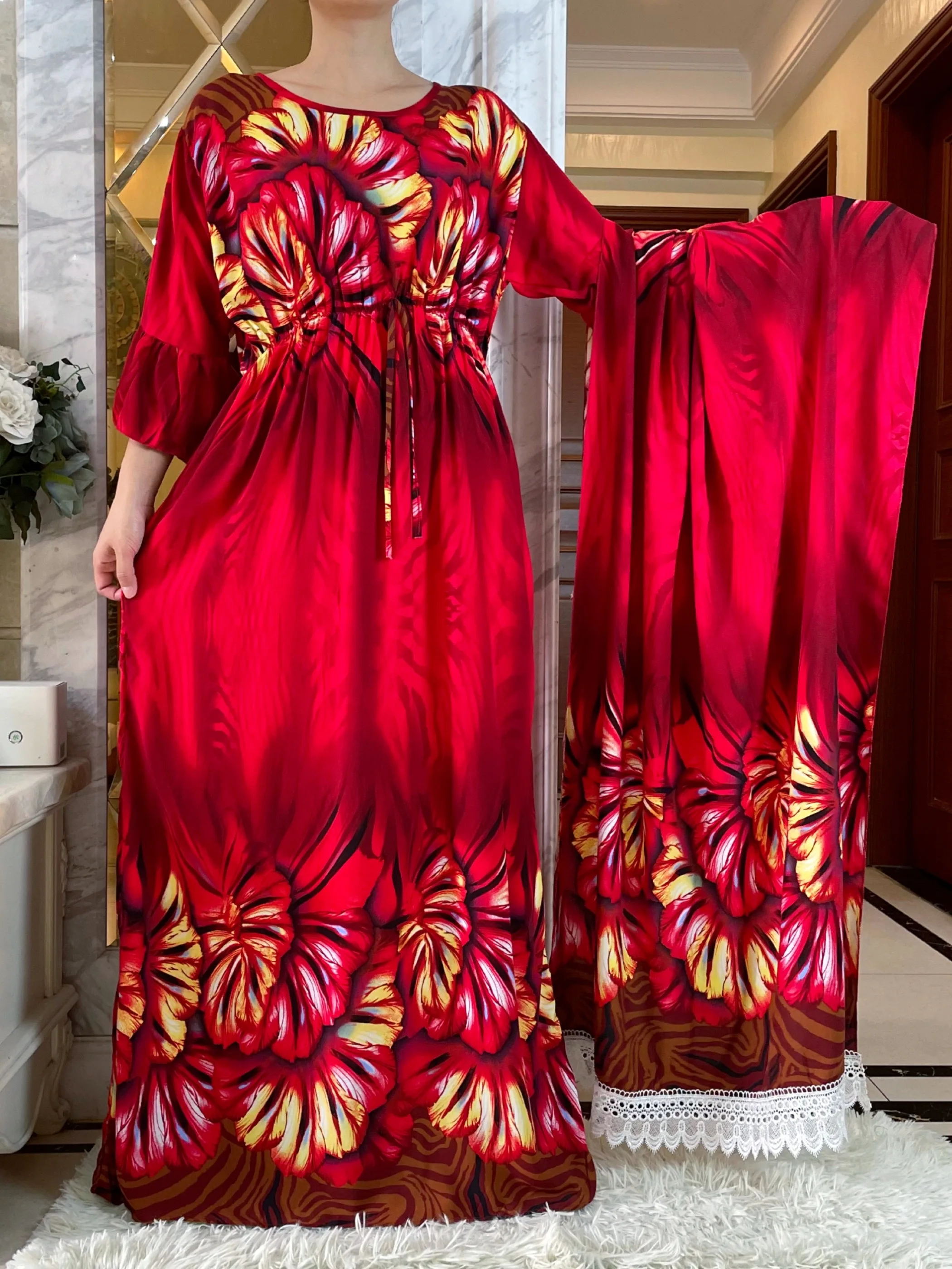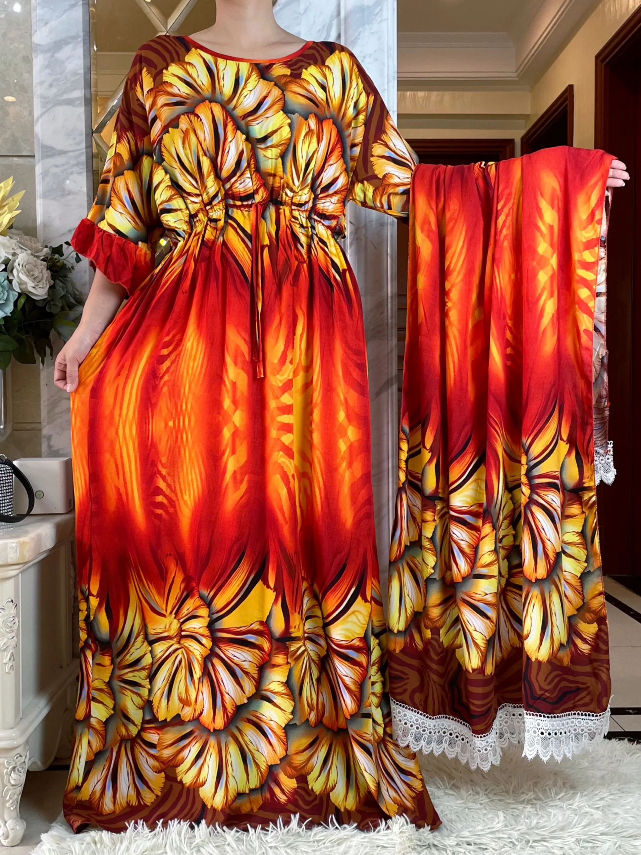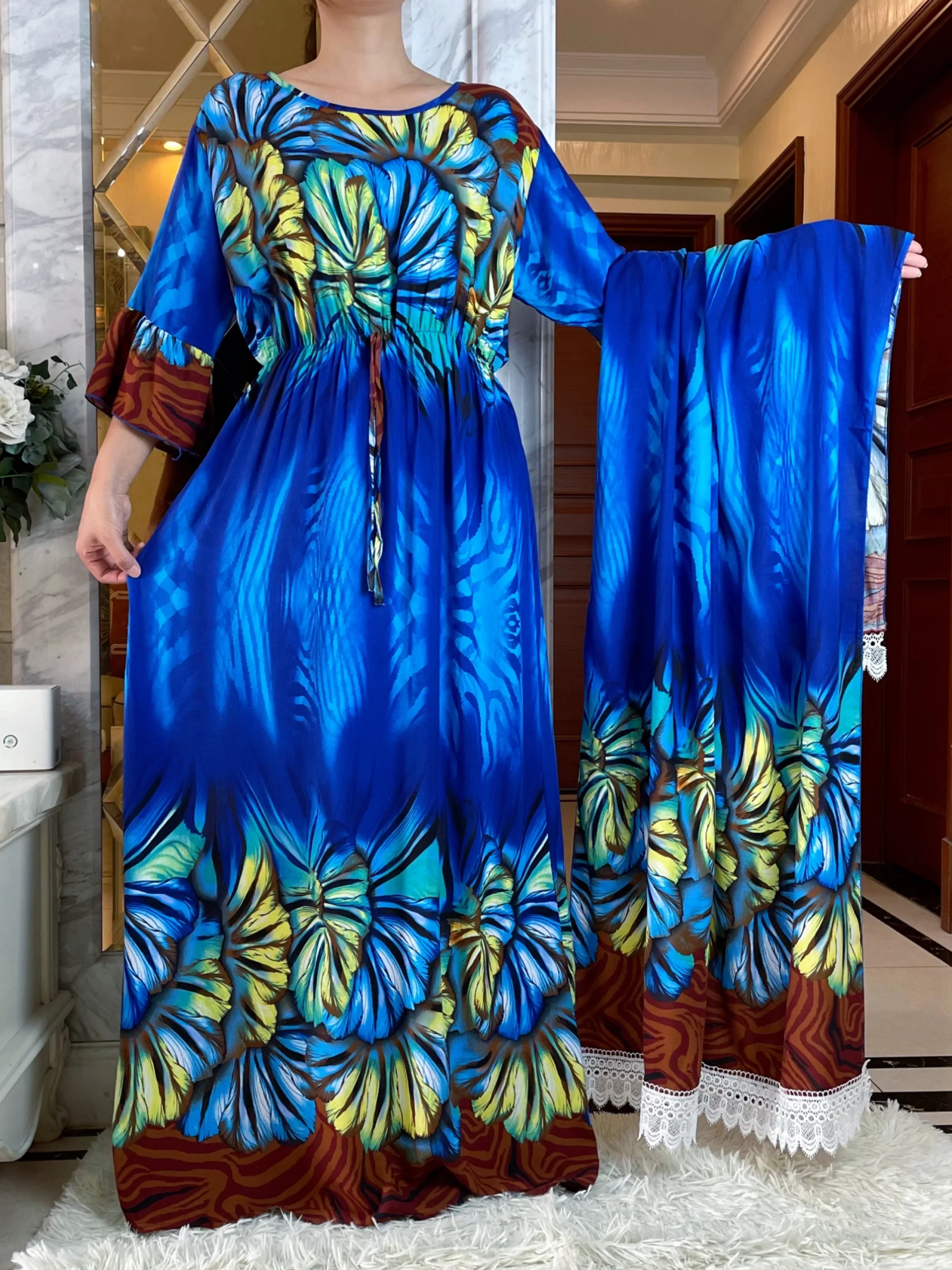 Latest African Women Summer Half Sleeve Dress With Big Scarf Collect Waist Floral Boubou Maxi Islam Cotton Elegant Abaya Clothes