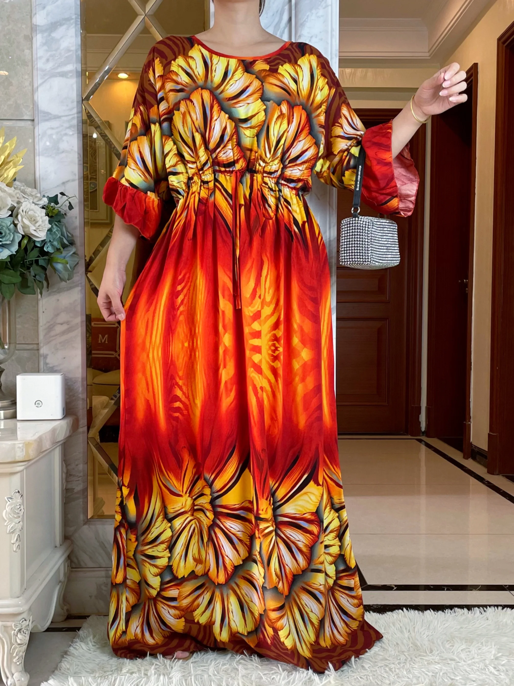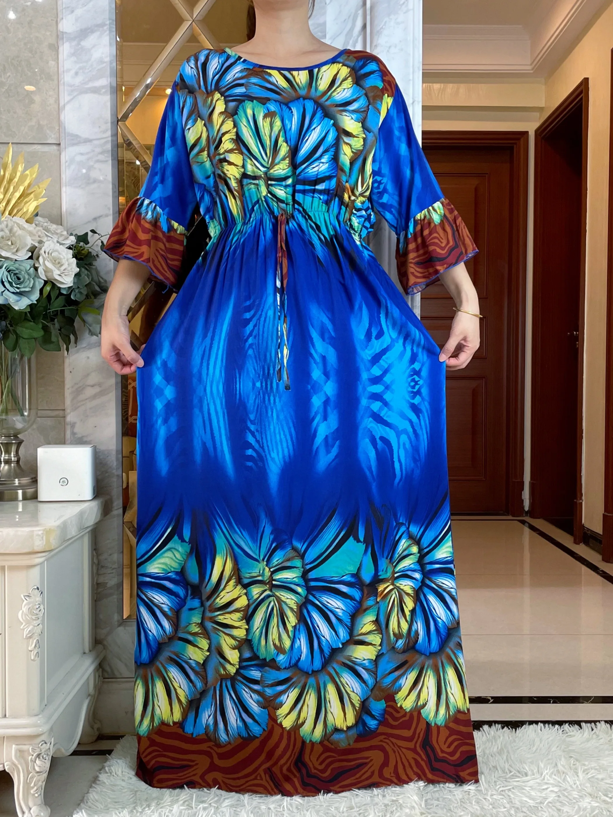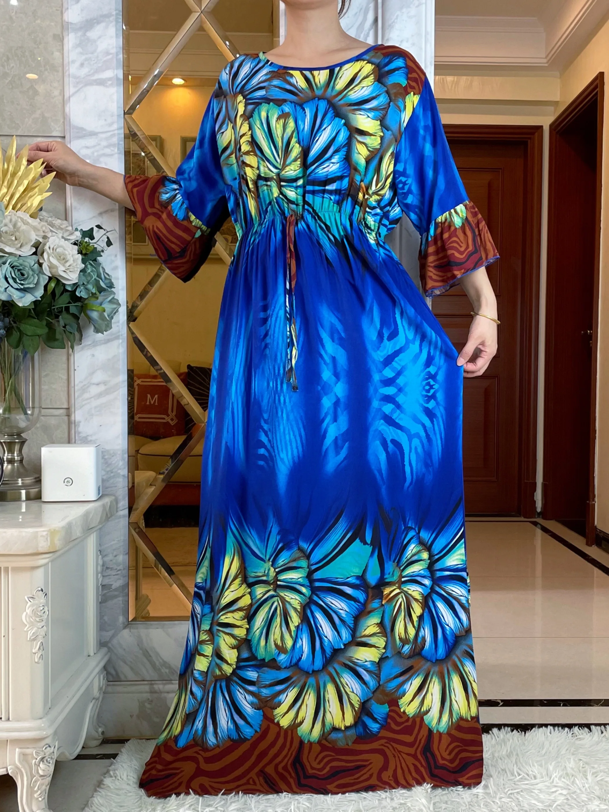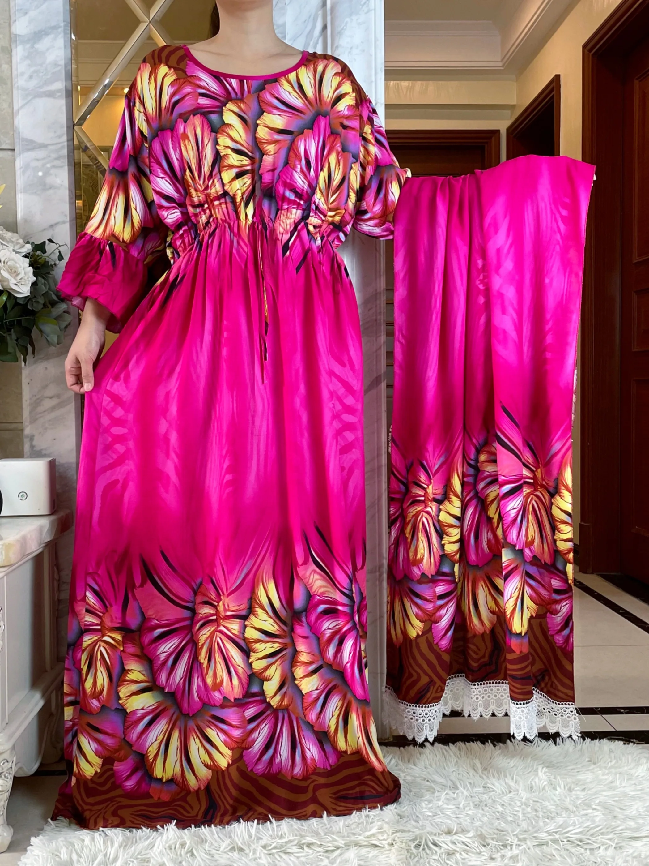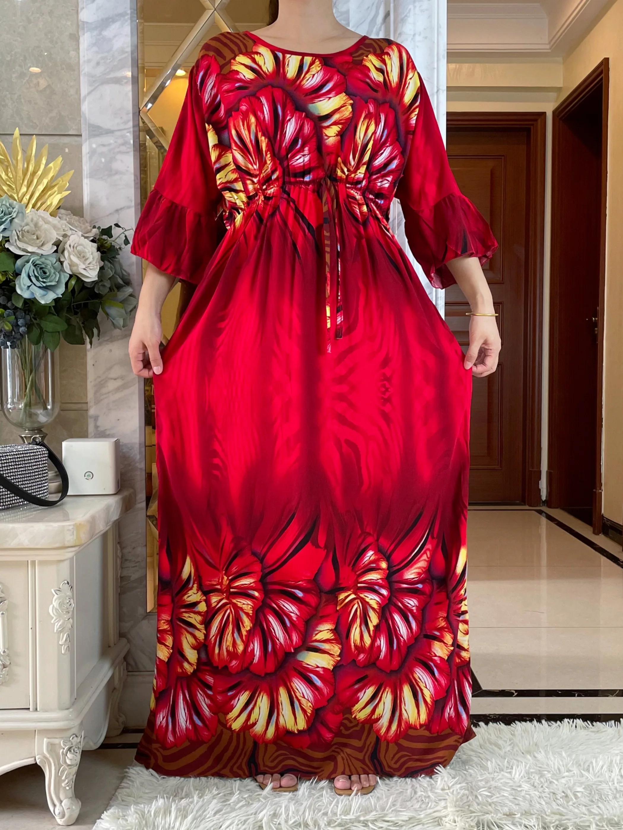 Latest African Women Summer Half Sleeve Dress With Big Scarf Collect Waist Floral Boubou Maxi Islam Cotton Elegant Abaya Clothes