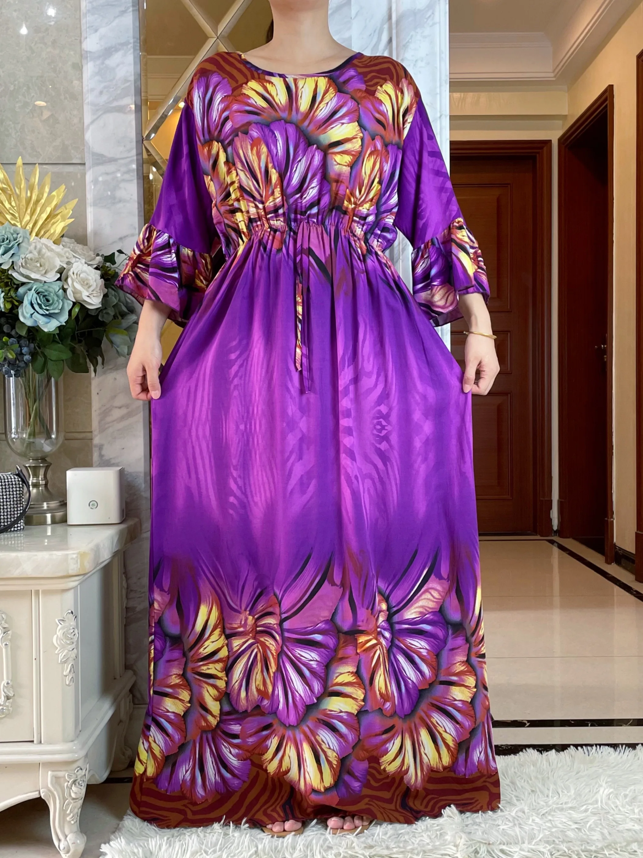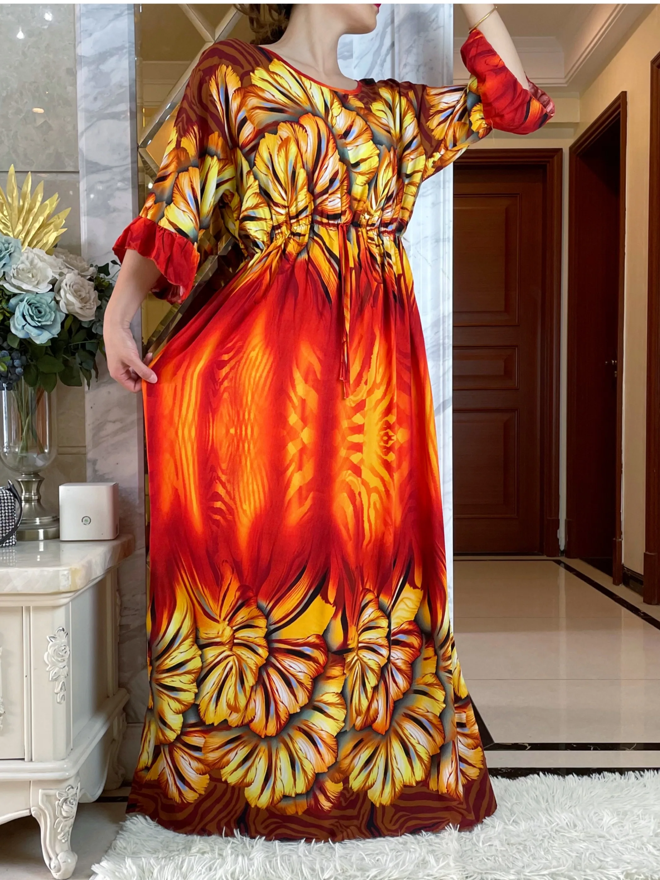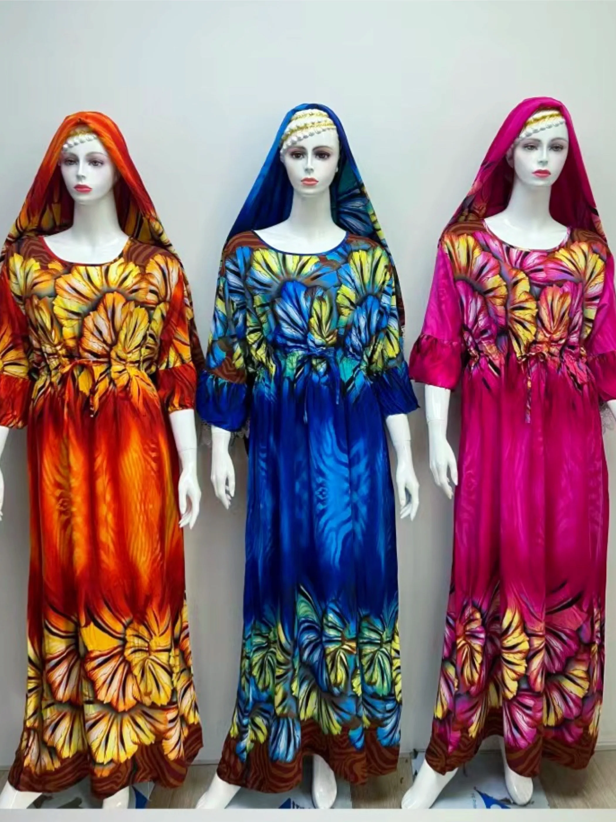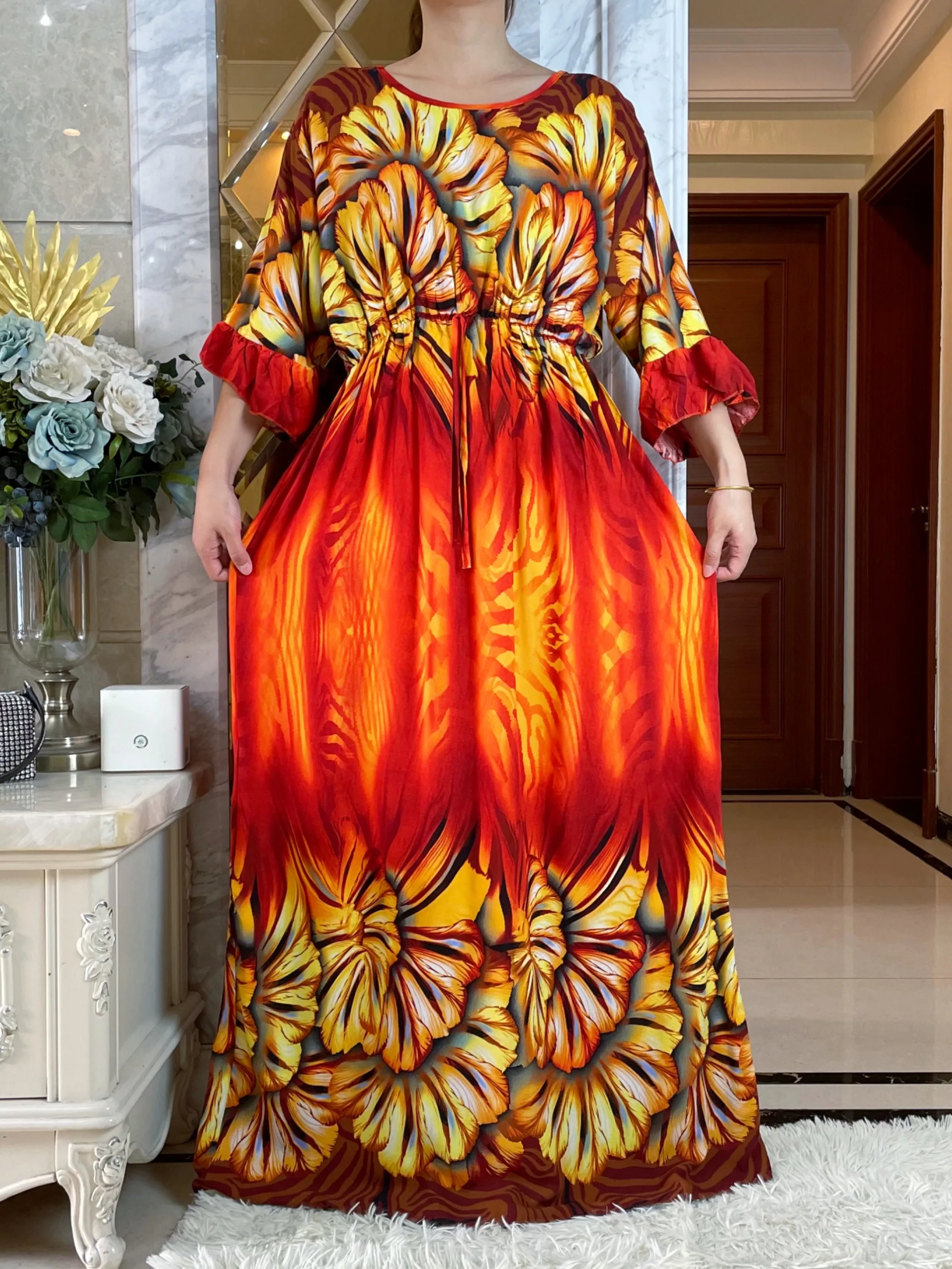 Latest African Women Summer Half Sleeve Dress With Big Scarf Collect Waist Floral Boubou Maxi Islam Cotton Elegant Abaya Clothes