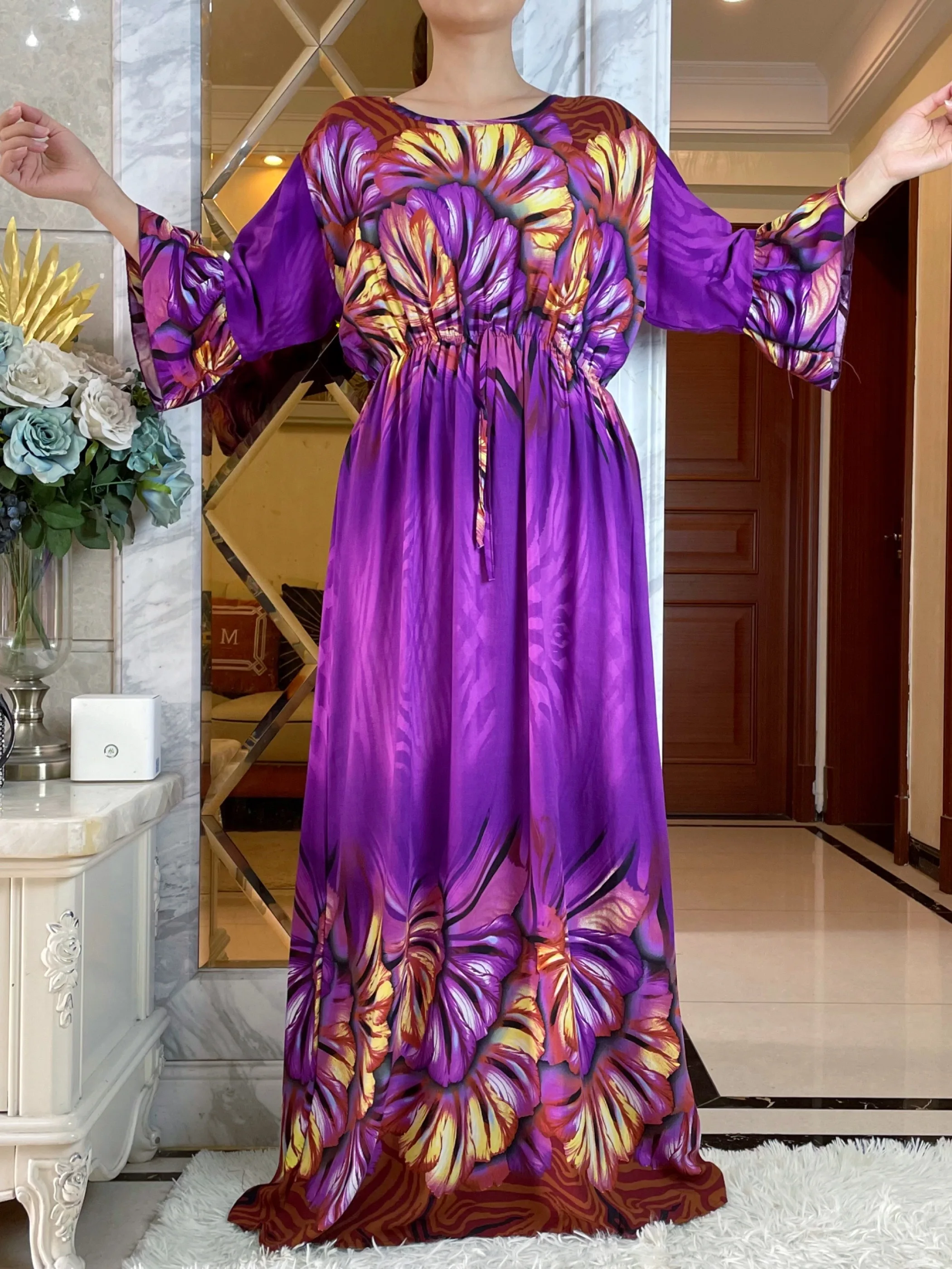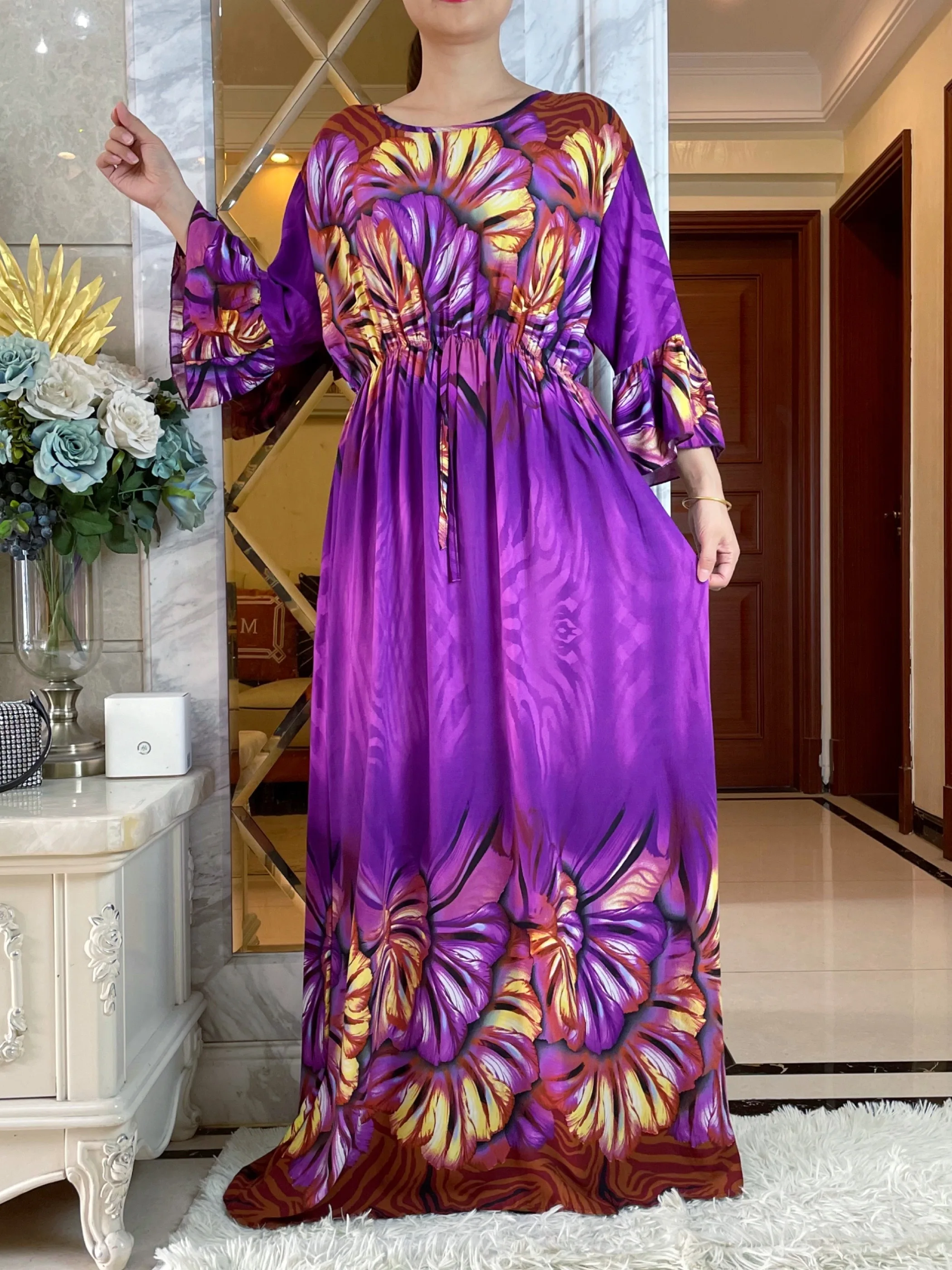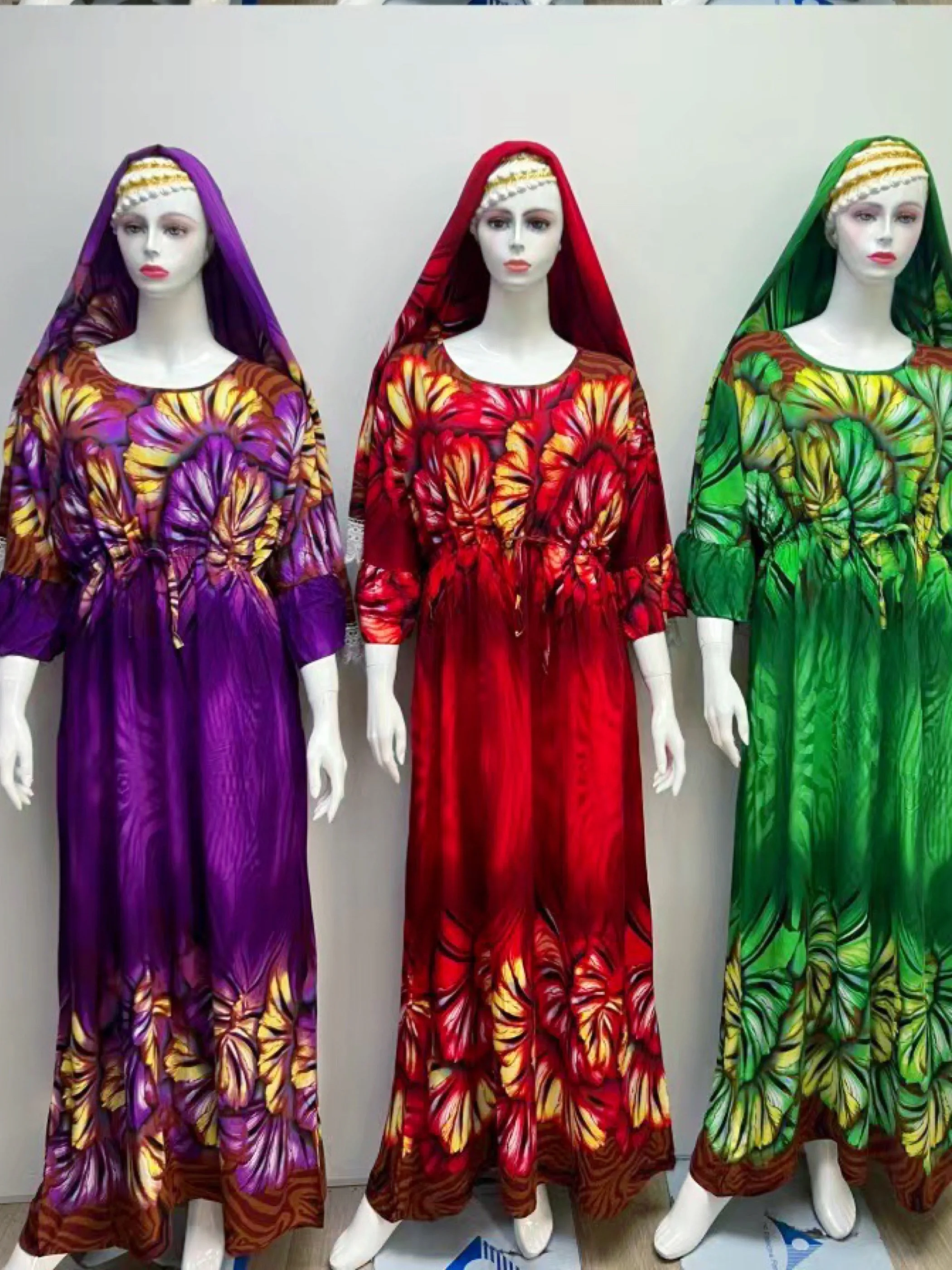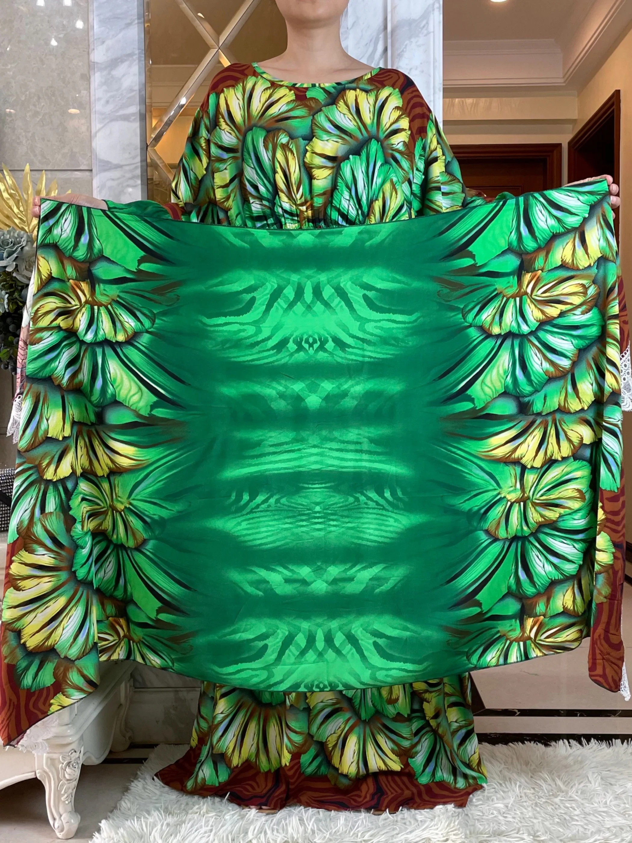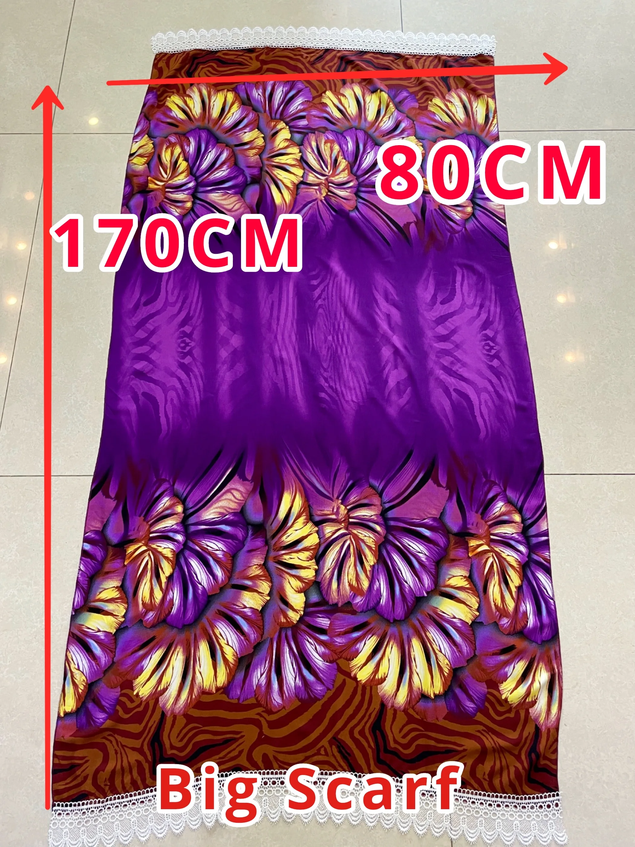 Latest African Women Summer Half Sleeve Dress With Big Scarf Collect Waist Floral Boubou Maxi Islam Cotton Elegant Abaya Clothes