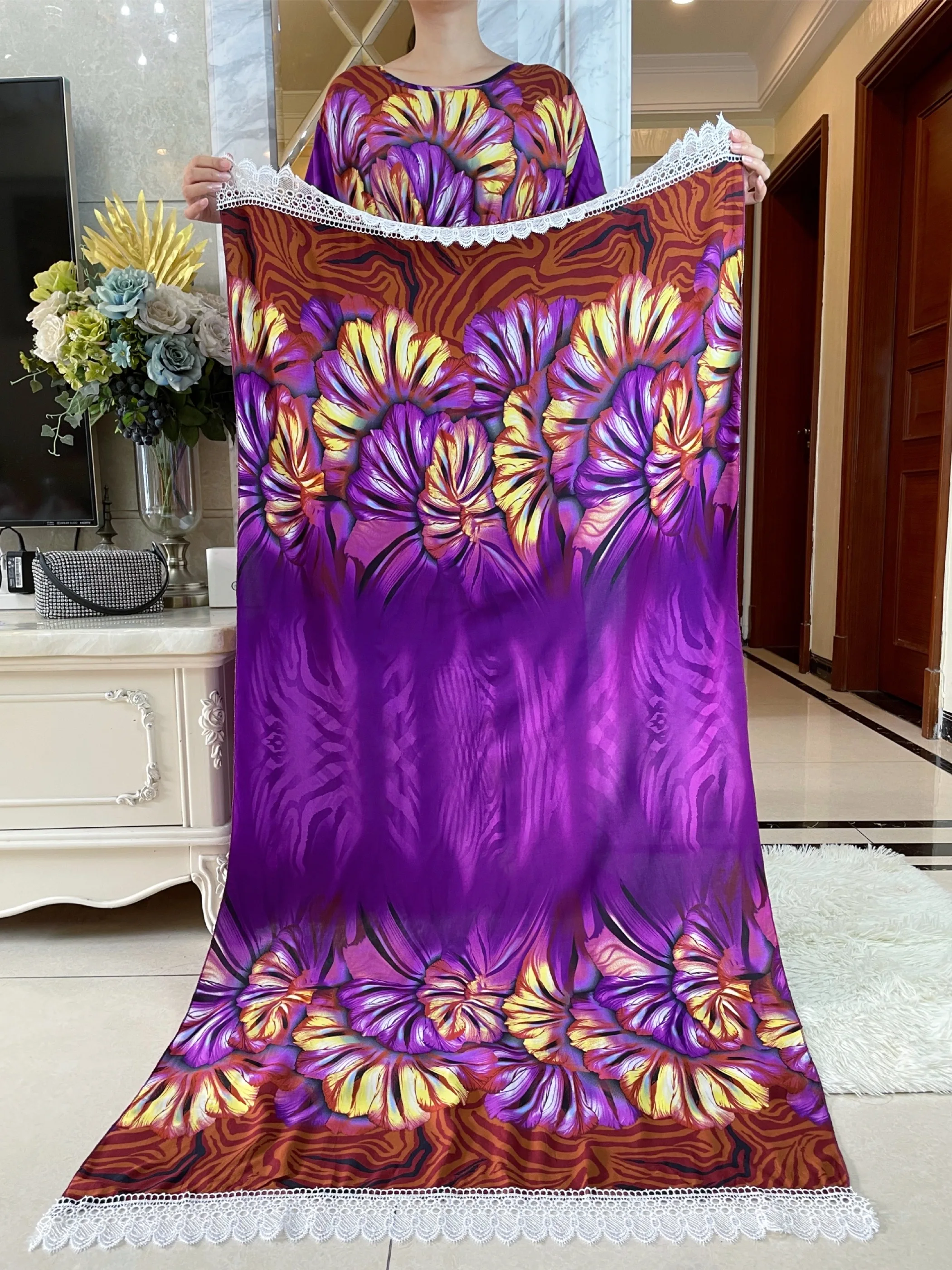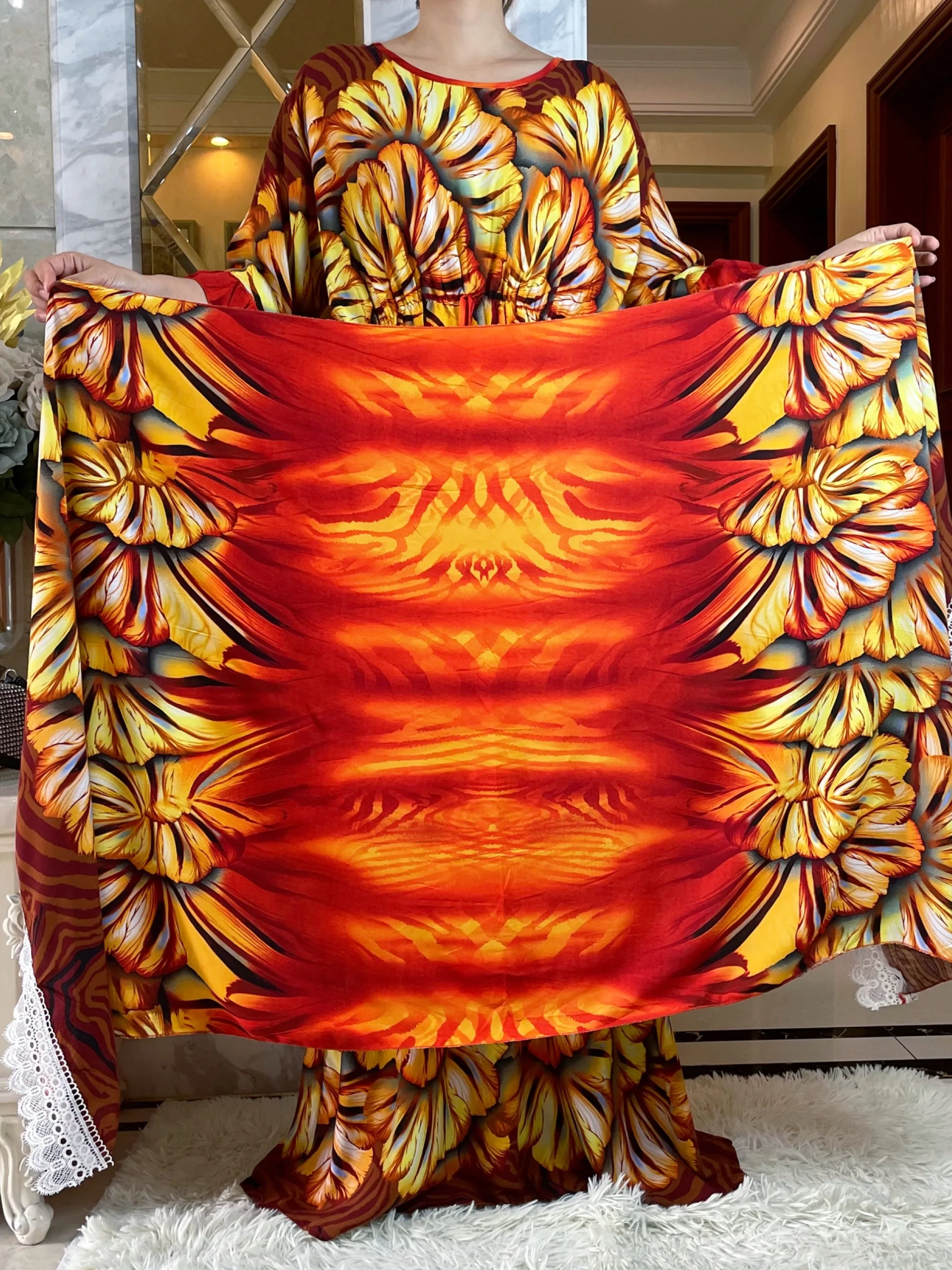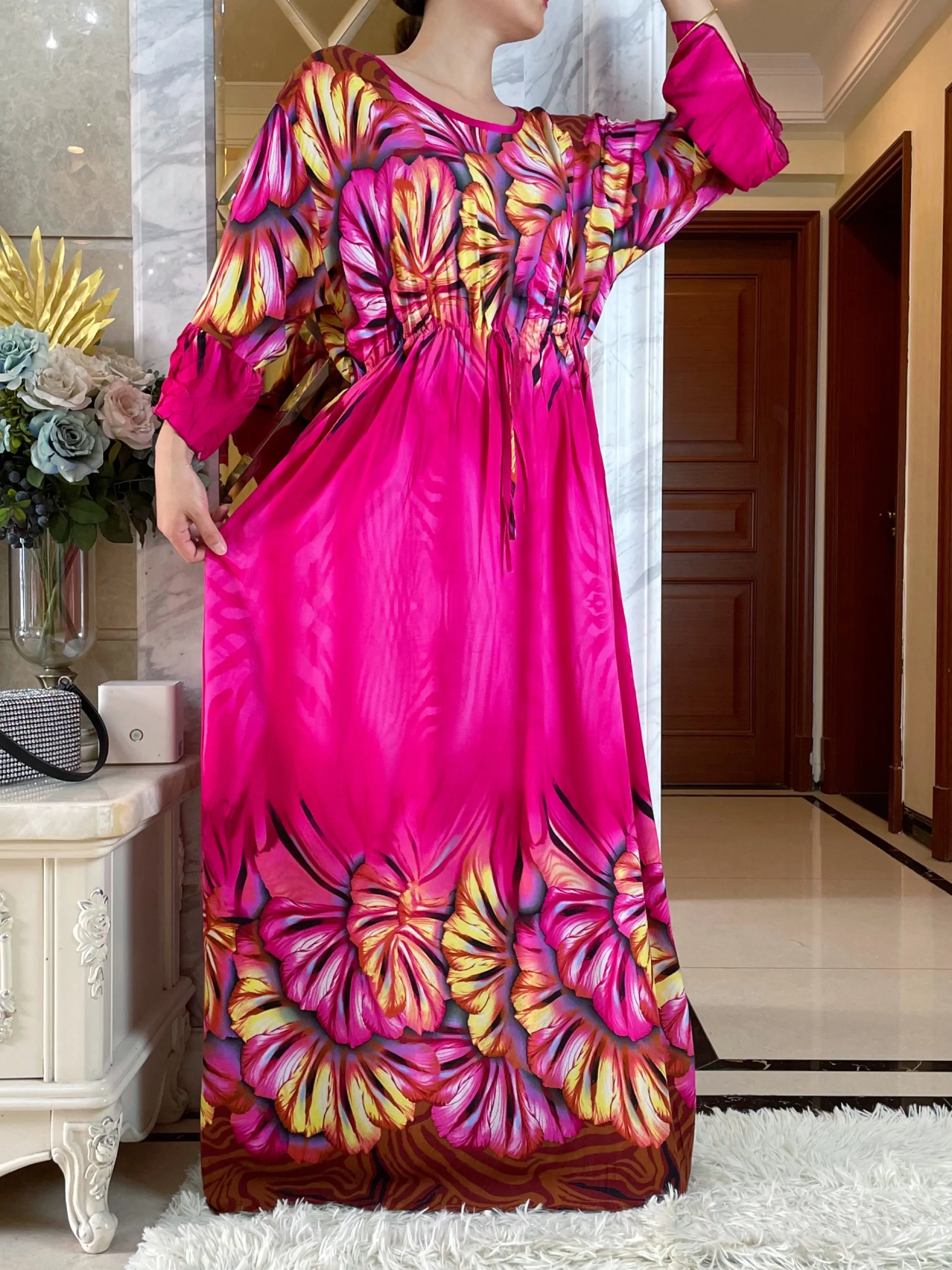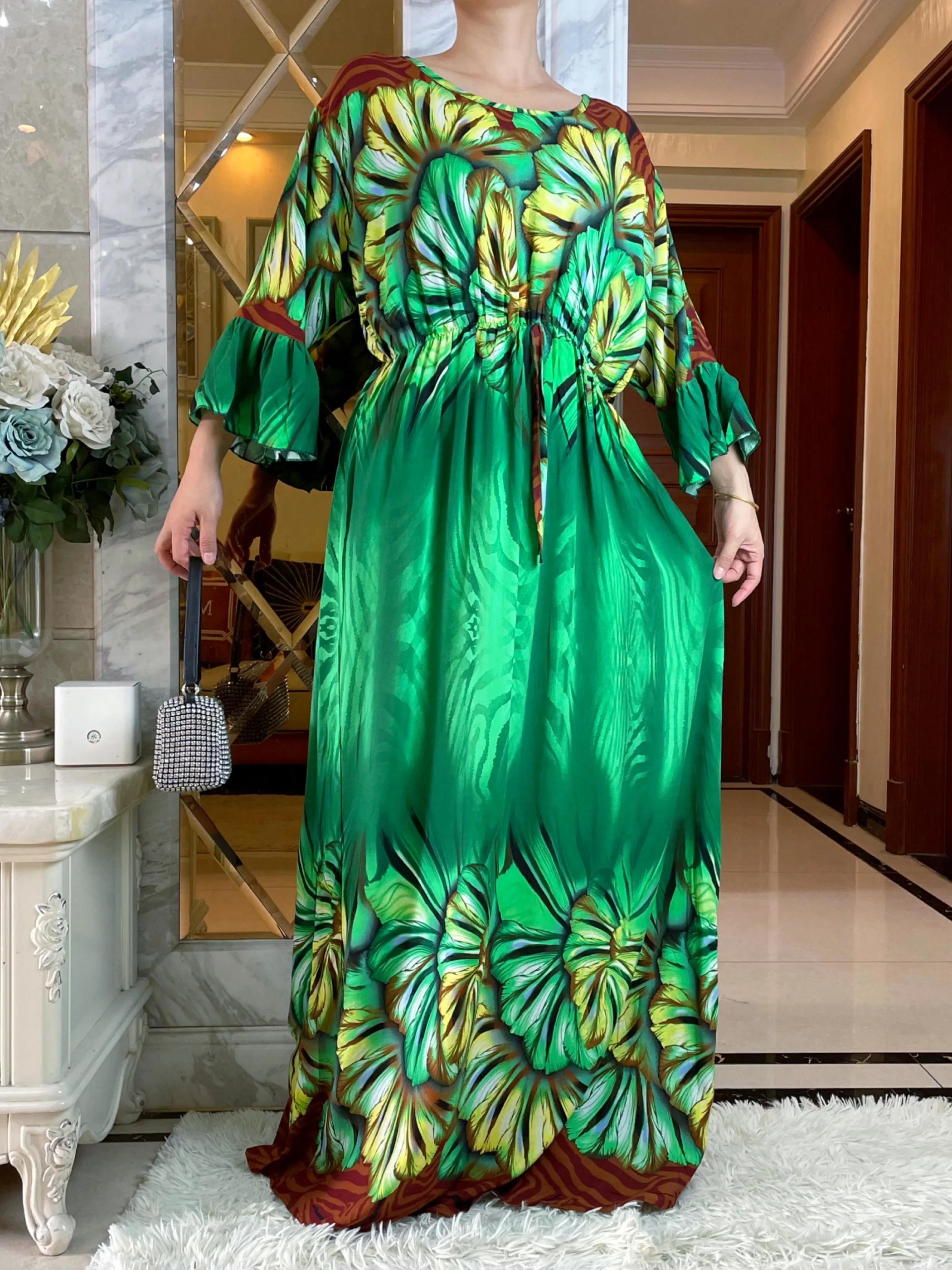 Latest African Women Summer Half Sleeve Dress With Big Scarf Collect Waist Floral Boubou Maxi Islam Cotton Elegant Abaya Clothes