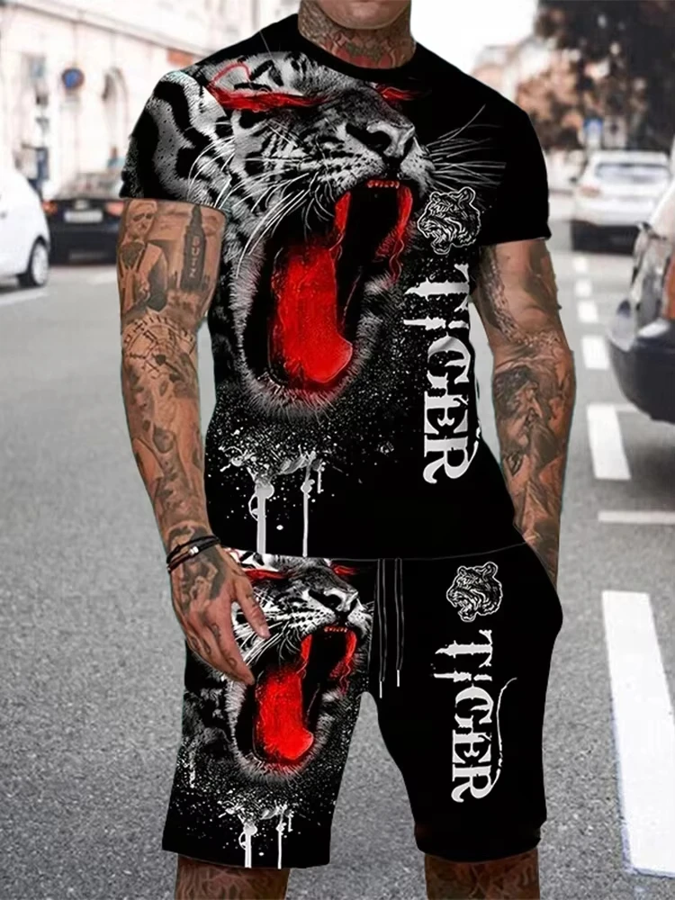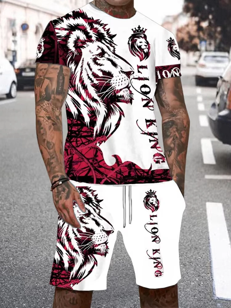 Summer Men Short Sleeve+ Shorts 2PCS Set Cool The Lion King 3D Print Kid T-Shirt +Drawstring Short Set Men's Set Clothing