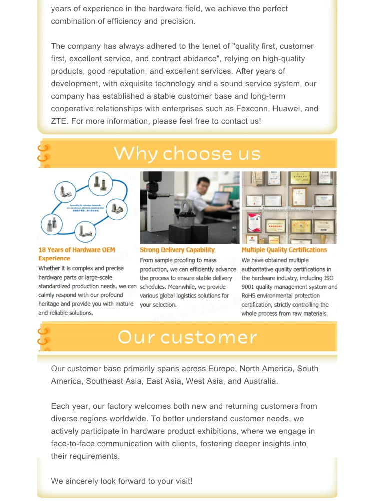 A1: We are a direct factory, and our production lines cover all standard and non-standard/special handles folding handles, fixed handles, as well as all standard and non-standard/special screws panel fasteners, captive screws, rivet screws, clinch nuts, hex standoffs, brass insert nuts, rivet nuts, rivet studs, etc., which can be produced according to your requirements.